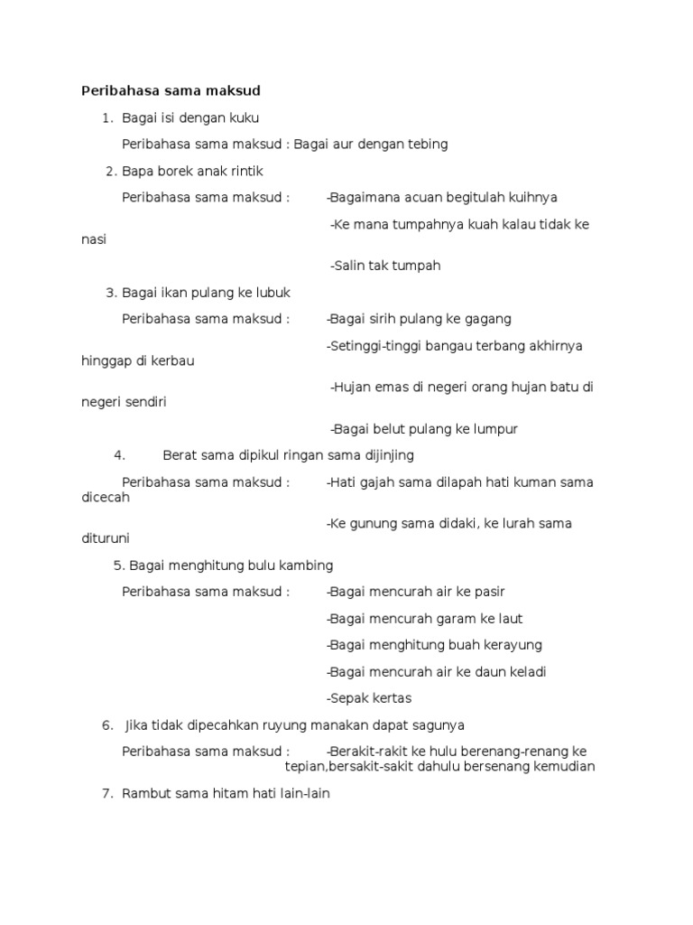 Umpama orang mengantuk disorongkan bantal. Bagaimana acuan begitulah kuihnya bagaimana contoh begitulah gubahannya. Ke mana tumpahnya kuah kalau tidak ke nasi.